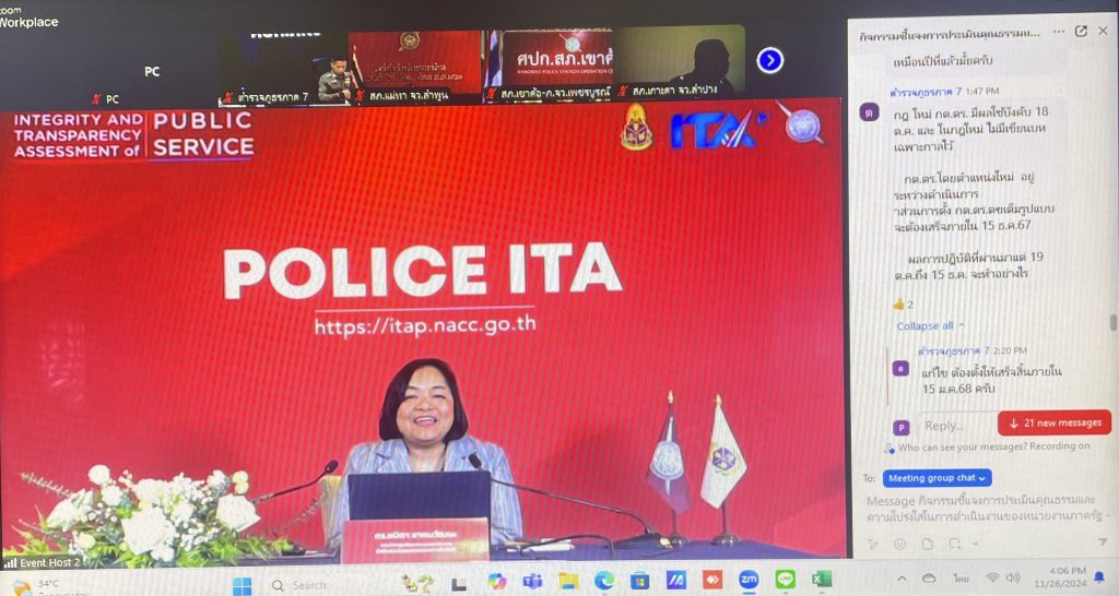 การประชุมเตรียมความพร้อมการจัดทำ ITA 27 พฤศจิกายน 2567 โดย admin / ข่าวภารกิจผู้บังคับบัญชา วันที่ 26 พฤศจิกายน 2567 เวลา 09.00 น. พ.ต.อ.อุรัมพร ขุนเดชสัมฤทธิ์ ผกก.สน.มักกะสัน พร้อมด้วยเจ้าหน้าที่ผู้รับผิดชอบ ร่วมการประชุมเตรียมความพร้อมการประเมินคุณธรรมและความโปร่งใสในการดำเนินงานของหน่วยงานภาครัฐ (Integrity & Transparency Assessment : ITA) ของสถานีตำรวจนครบาลมักกะสัน ประจำปีงบประมาณ พ.ศ.2568 โดยได้รับฟังแนวทางการปฏิบัติ และข้อแนะนำจากเจ้าหน้าที่ ของสำนักงาน ป.ป.ช. ผ่านระบบ การประชุมทางไกล (Zoom) ณ ห้องประชุม สน.มักกะสัน FacebookFacebookXXLINELine